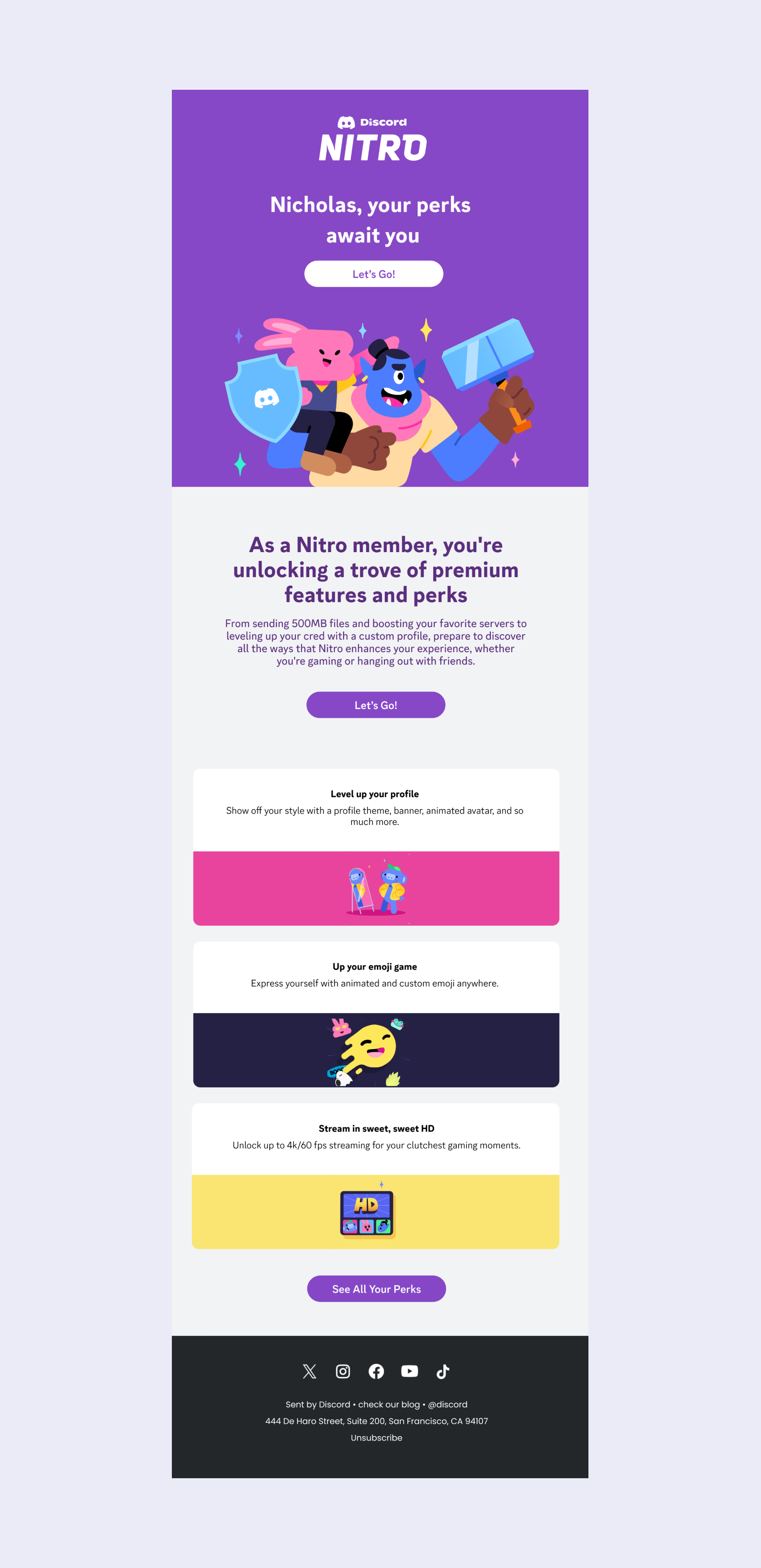 Nitro is a subscription service that unlocks features and perks across Discord, giving you more ways to have fun and express yourself.